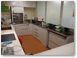ソフトクローズ機構付レール(底面レール仕様により粉塵が付着しにくい構造になっています)天板 人工大理石(継ぎ目を隠すシームレスジョイントにより一枚板のような仕上がりになります) 対面対策 向かい合わせの技工机の間仕切りとしてタペストリーガラスを使用しています